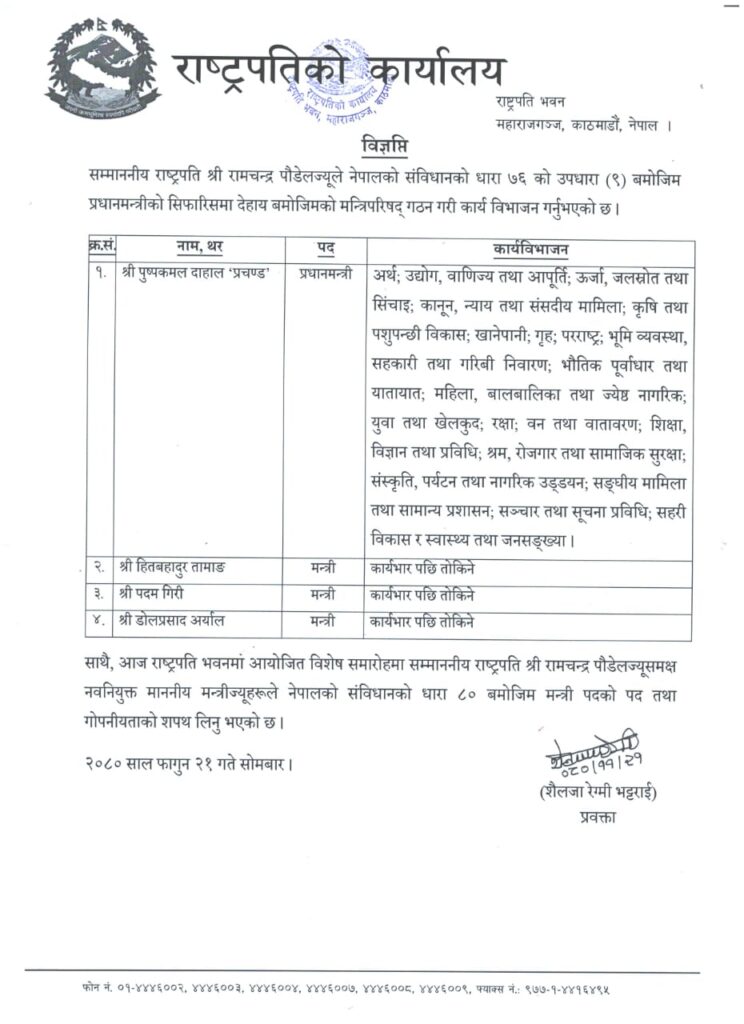 राष्ट्रपति कार्यालयबाट जारी विज्ञप्तिमा नेपालको संविधानको धारा ७६ को उपधारा ९ बमोजिम प्रधानमन्त्रीको सिफारिसमा मन्त्रिपरिषद् पुनर्गठन गरी कार्य विभाजन गरिएको उल्लेख छ।
